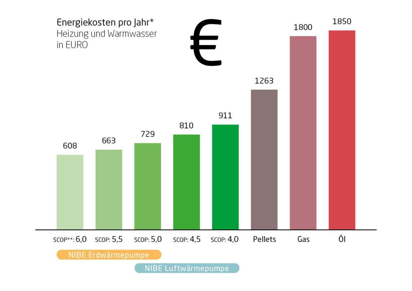 *Preise ohne Nebenkosten: Stromanteil bei Pellets, Öl und Gas sowie Kaminkehrer und Service wurden nicht eingerechnet. Angenommene Gebäudekenndaten: 180 m2 beheizte Wohnfläche mit einem Energieverbrauch inkl. Warmwasser-Bereitung (4-Personen-Haushalt) von 15.000 kWh.